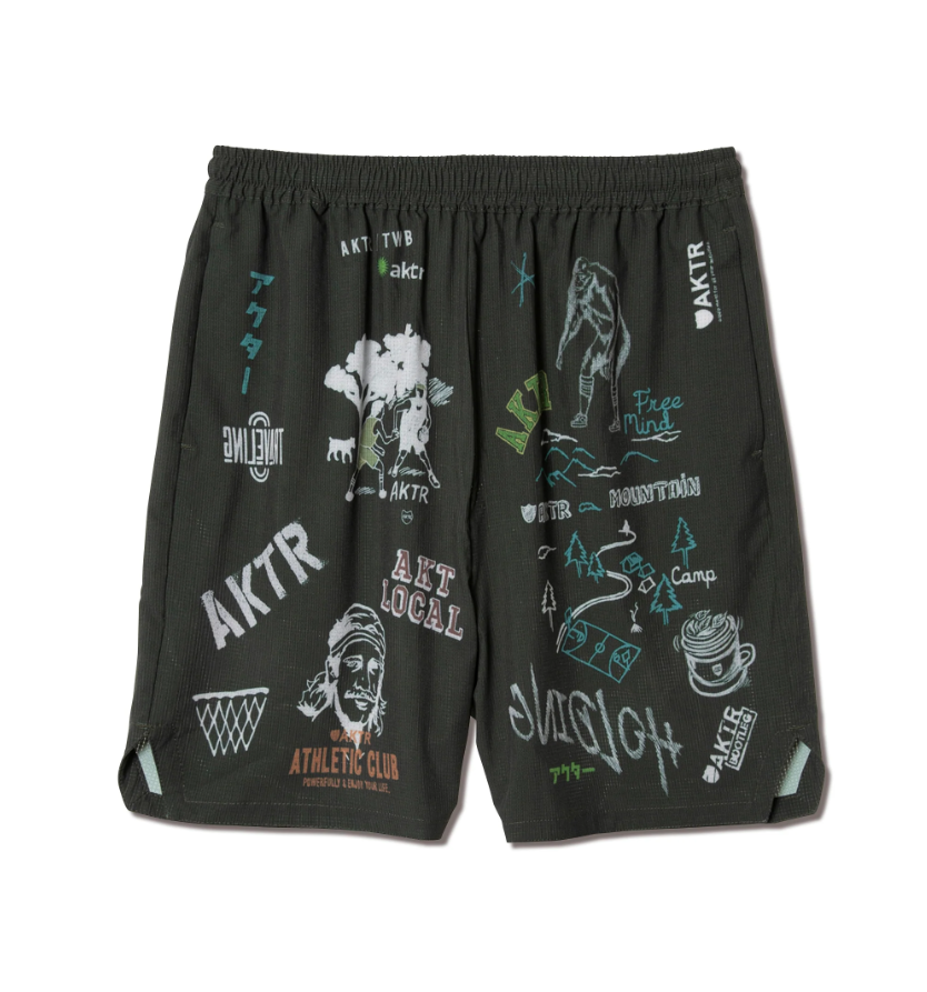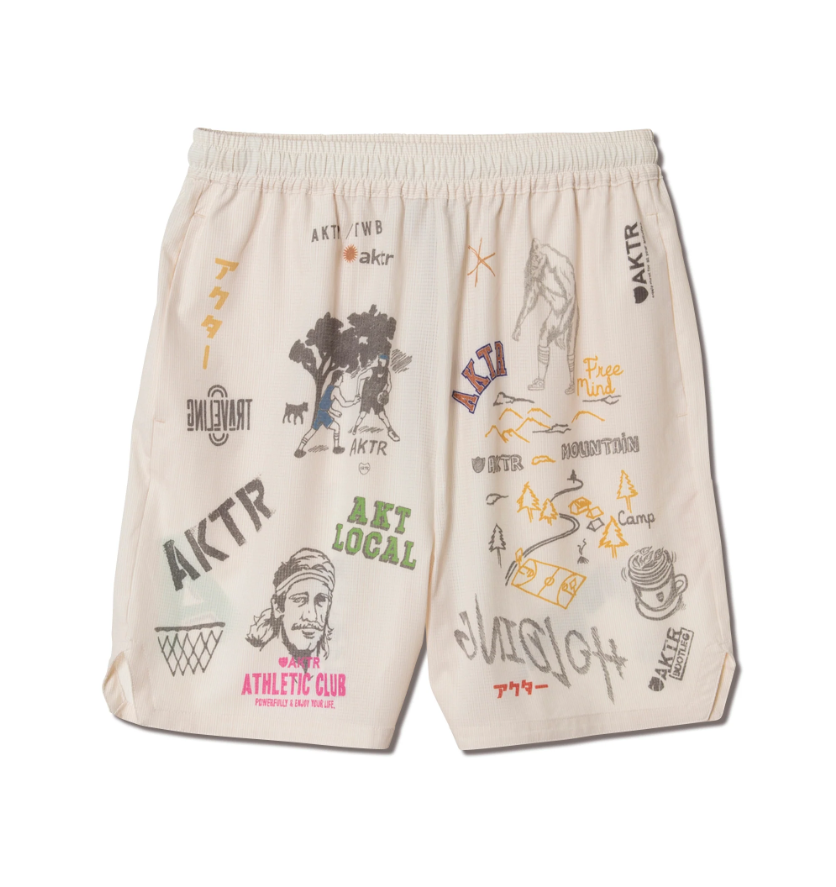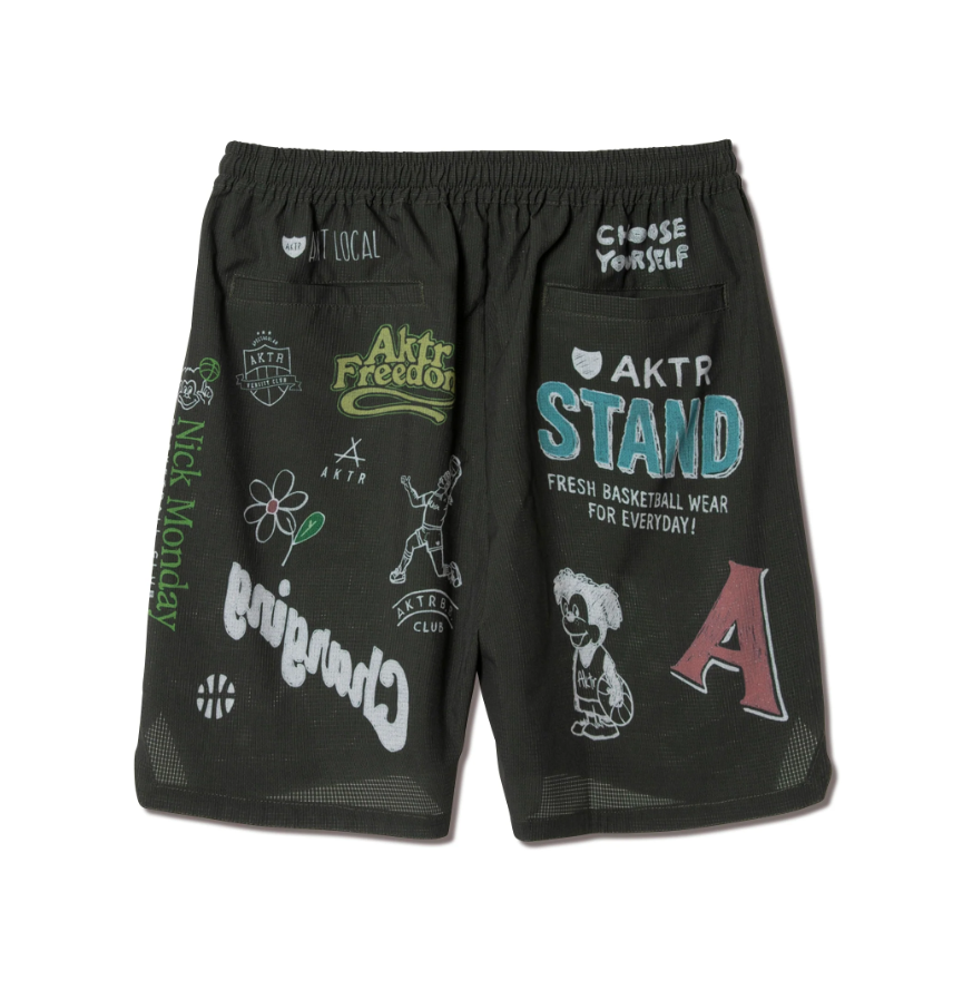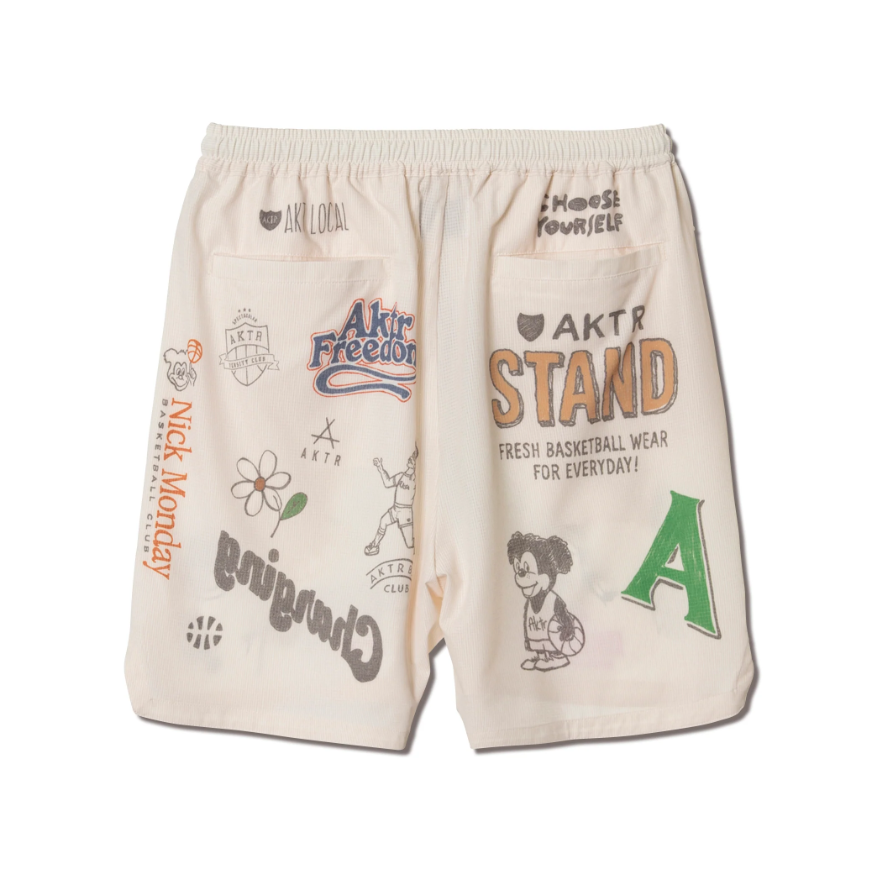 design:40年代のアメリカで、学校の卒業記念としてパンツに寄せ書きをしていた文化「メモリアルパンツ」をモチーフに、AKTRの今までのグラフィックを用いてデザインしたシリーズのショーツ。AKTRのショーツの中では股下を一番短く設定し、横巾を通常よりも広くすることにより、動きやすさを考慮したバランスのとれたワイドシルエットになっている。